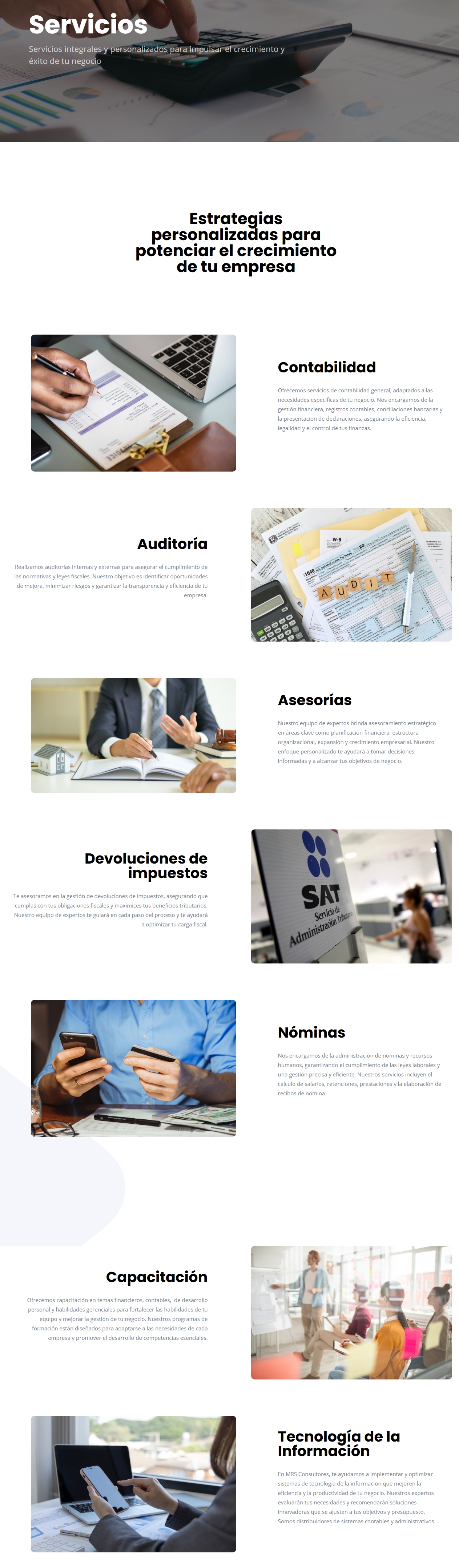 MRS Consultores es una firma especializada en ofrecer soluciones estratégicas en materia contable, fiscal, financiera y administrativa. Conformada por un equipo de expertos altamente capacitados, la empresa se distingue por su enfoque integral hacia la optimización de procesos y la creación de valor para sus clientes.